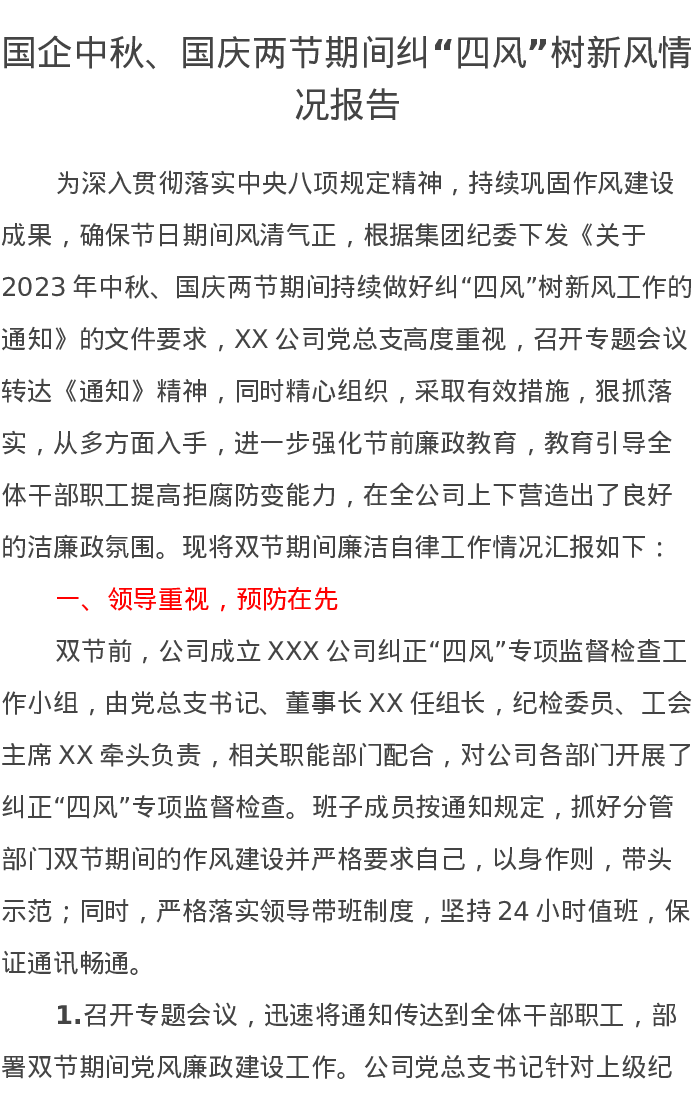国企中秋、国庆两节期间纠“四风”树新风情况报告