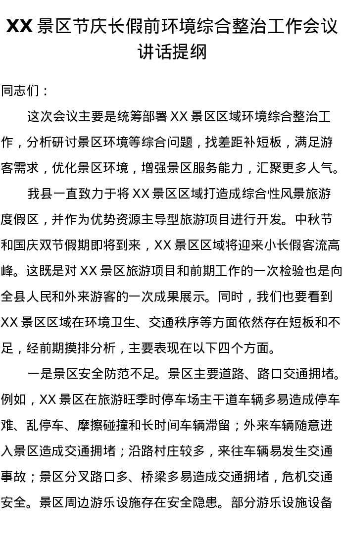 XX景区节庆长假前环境综合整治工作会议讲话提纲