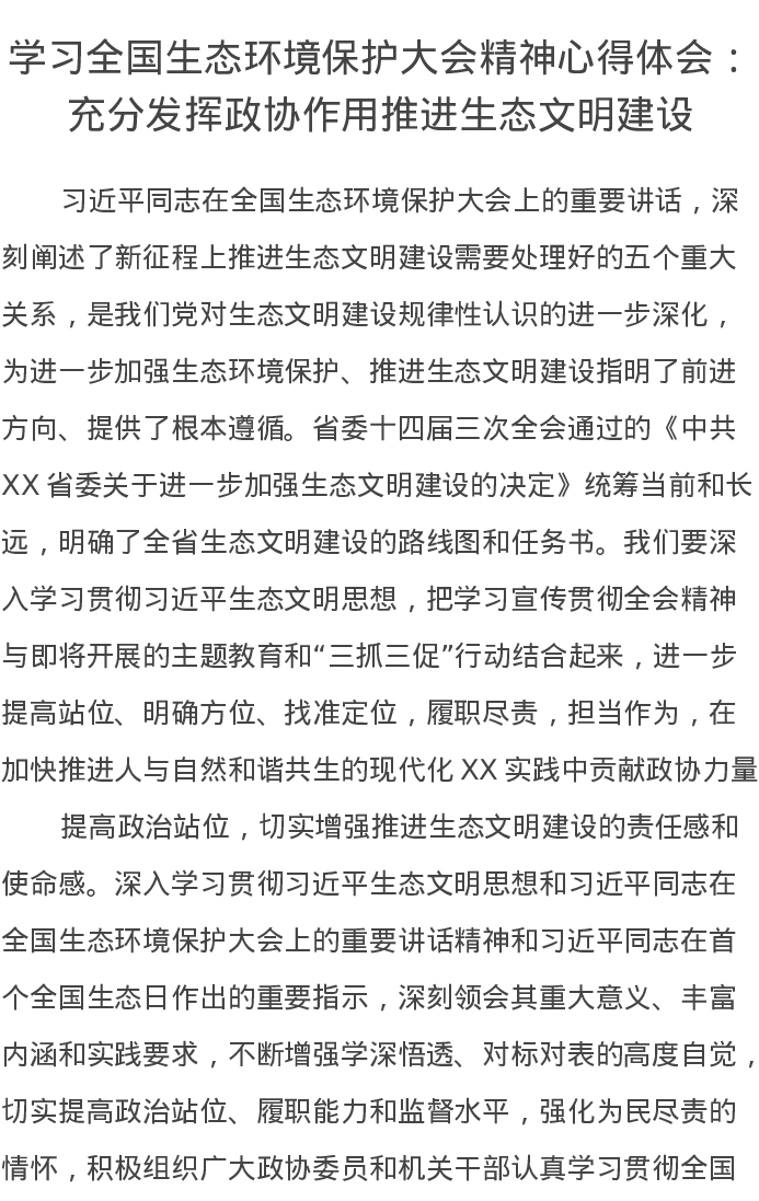 学习全国生态环境保护大会精神心得体会:充分发挥政协作用推进生态文明建设