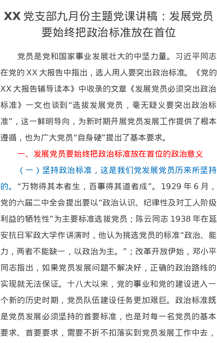XX党支部九月份主题党课讲稿:发展党员要始终把政治标准放在首位