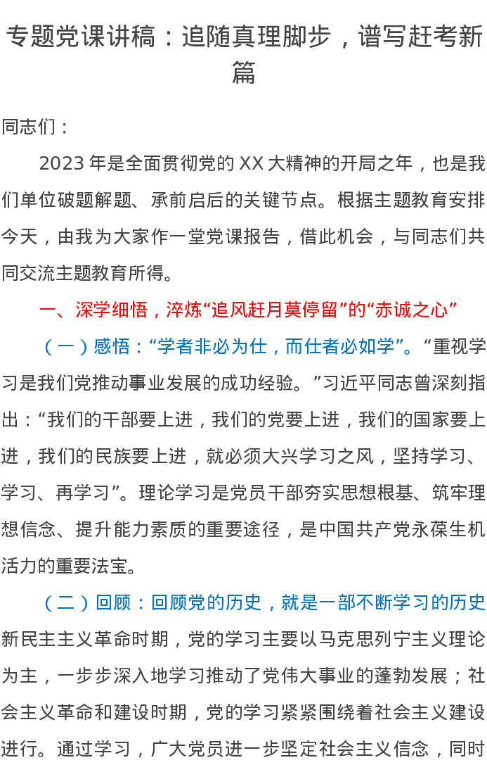 专题党课讲稿:追随真理脚步,谱写赶考新篇