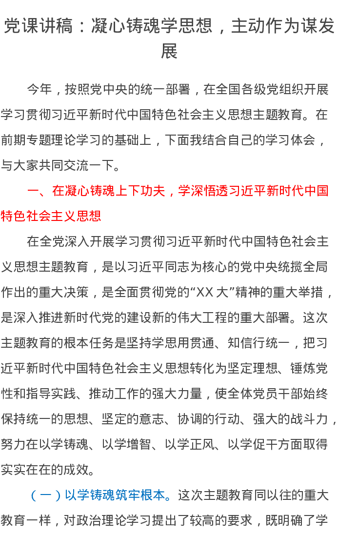 党课讲稿:凝心铸魂学思想,主动作为谋发展