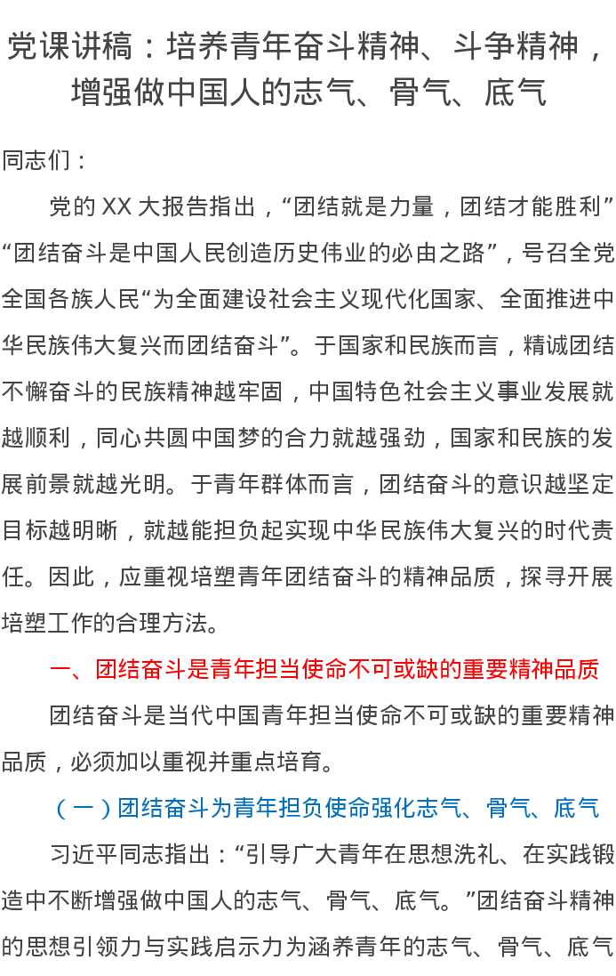 党课讲稿:培养青年奋斗精神、斗争精神,增强做中国人的志气、骨气、底气