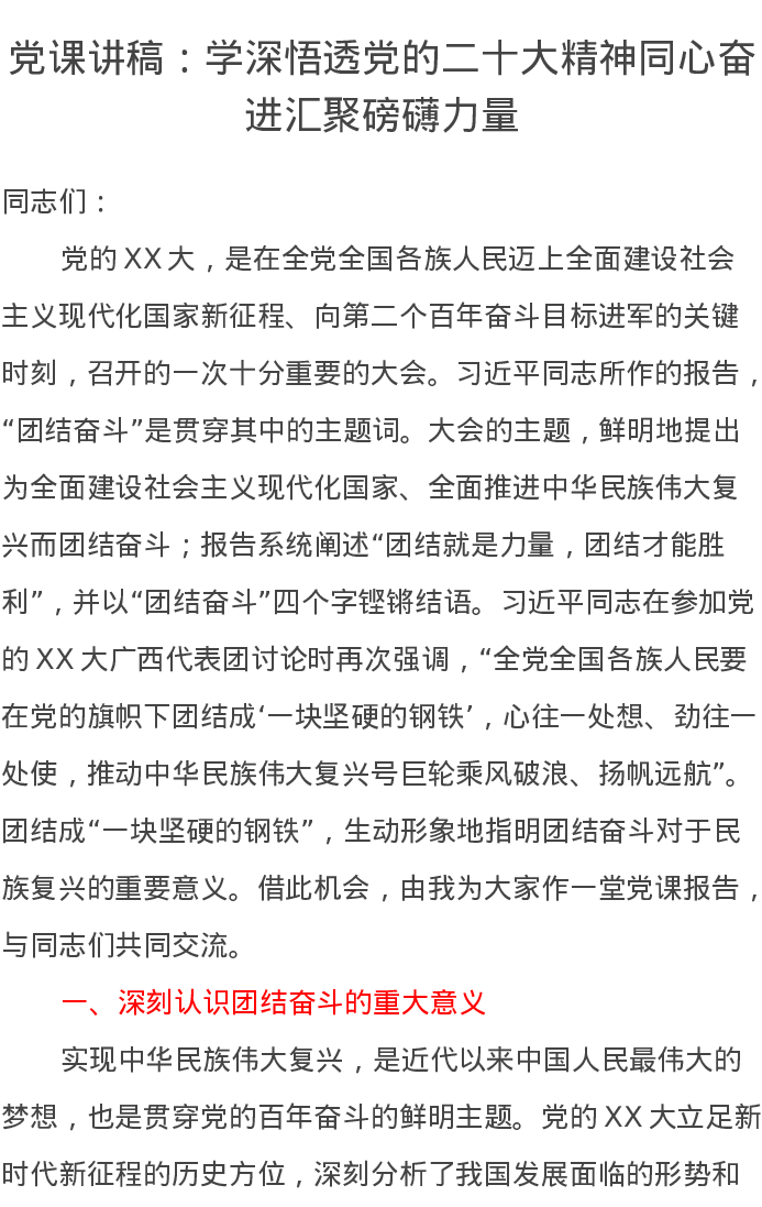党课讲稿:学深悟透党的二十大精神同心奋进汇聚磅礴力量