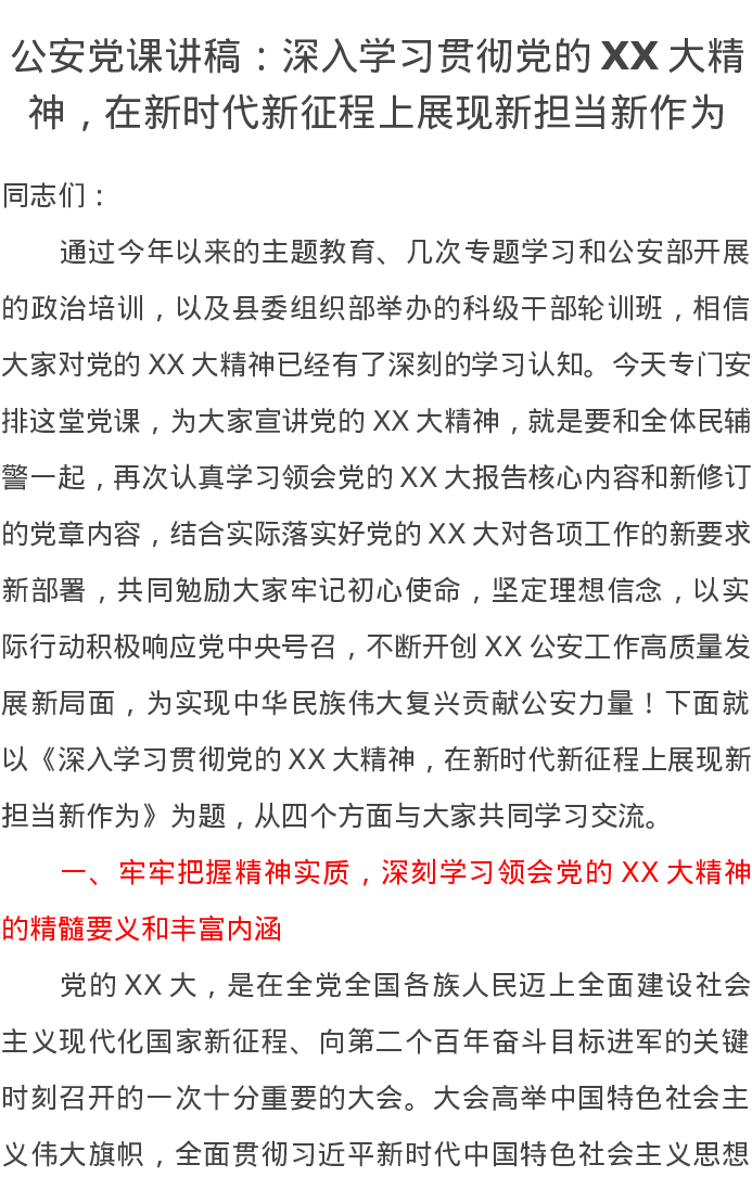 公安党课讲稿:深入学习贯彻党的二十大精神,在新时代新征程上展现新担当新作为
