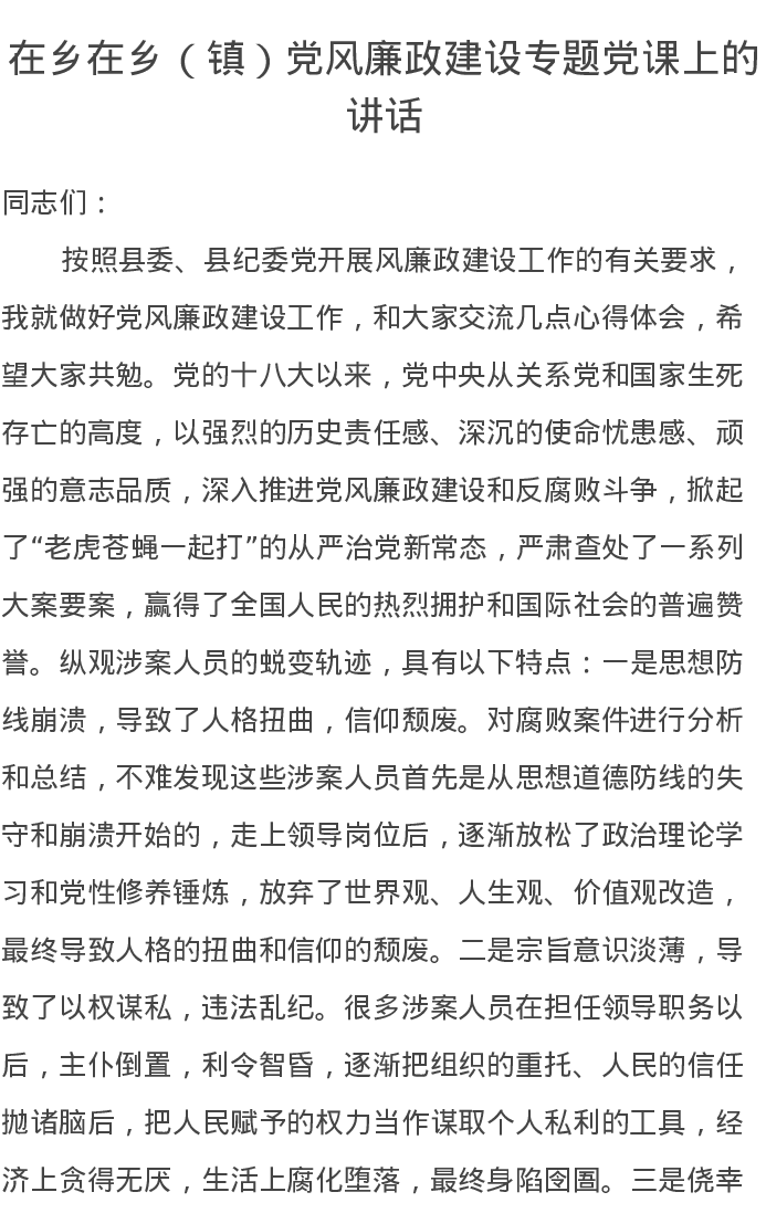 在乡在乡(镇)党风廉政建设专题党课上的讲话