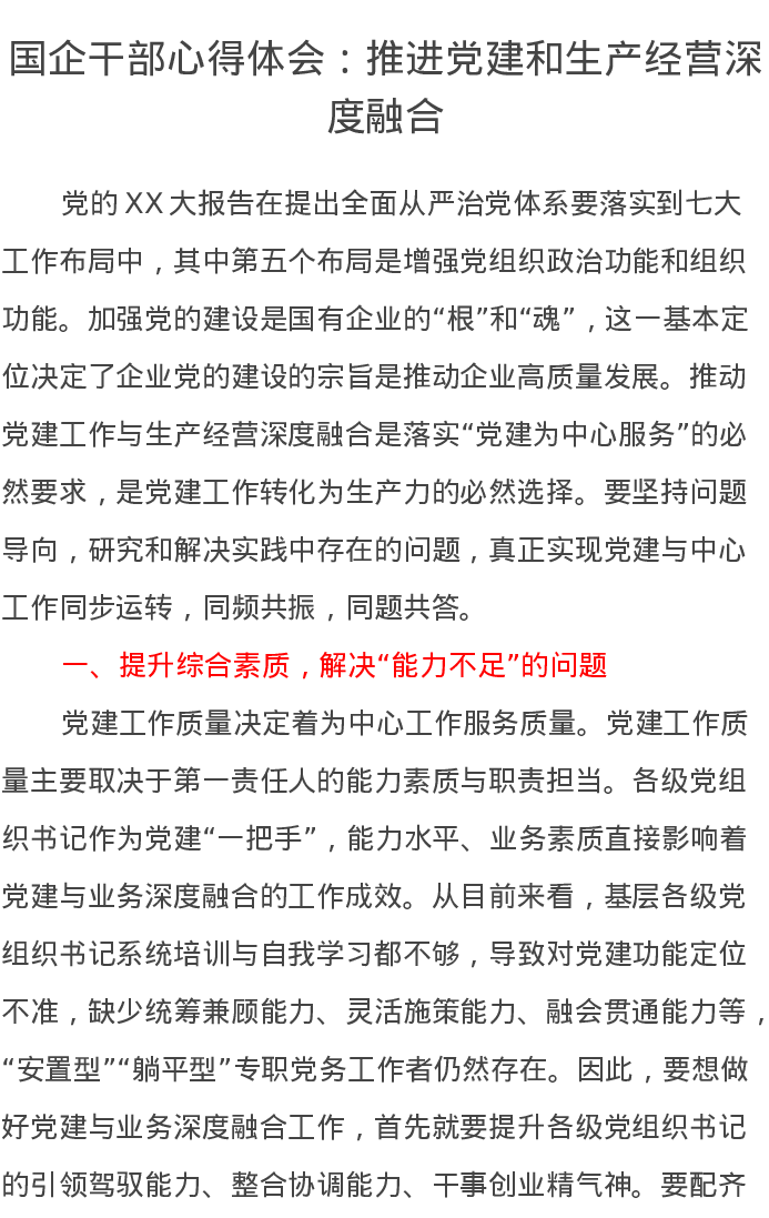 国企干部心得体会:推进党建和生产经营深度融合