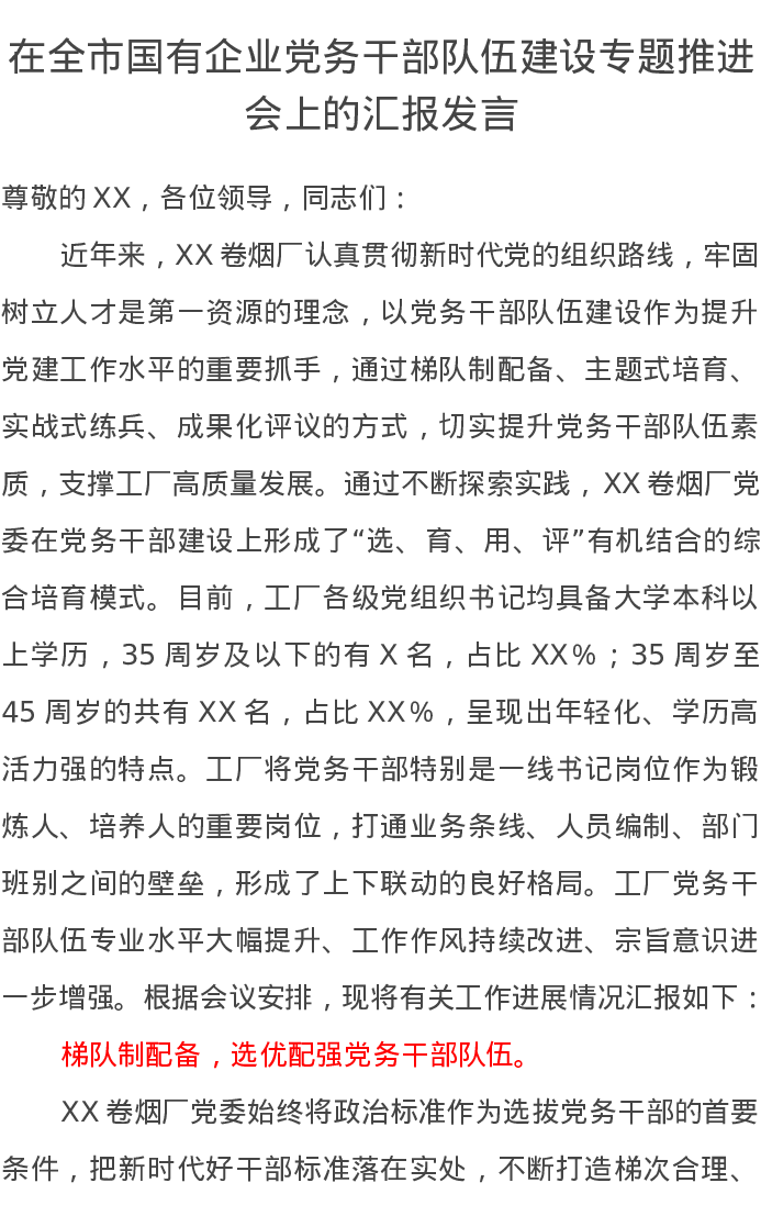 在全市国有企业党务干部队伍建设专题推进会上的汇报发言