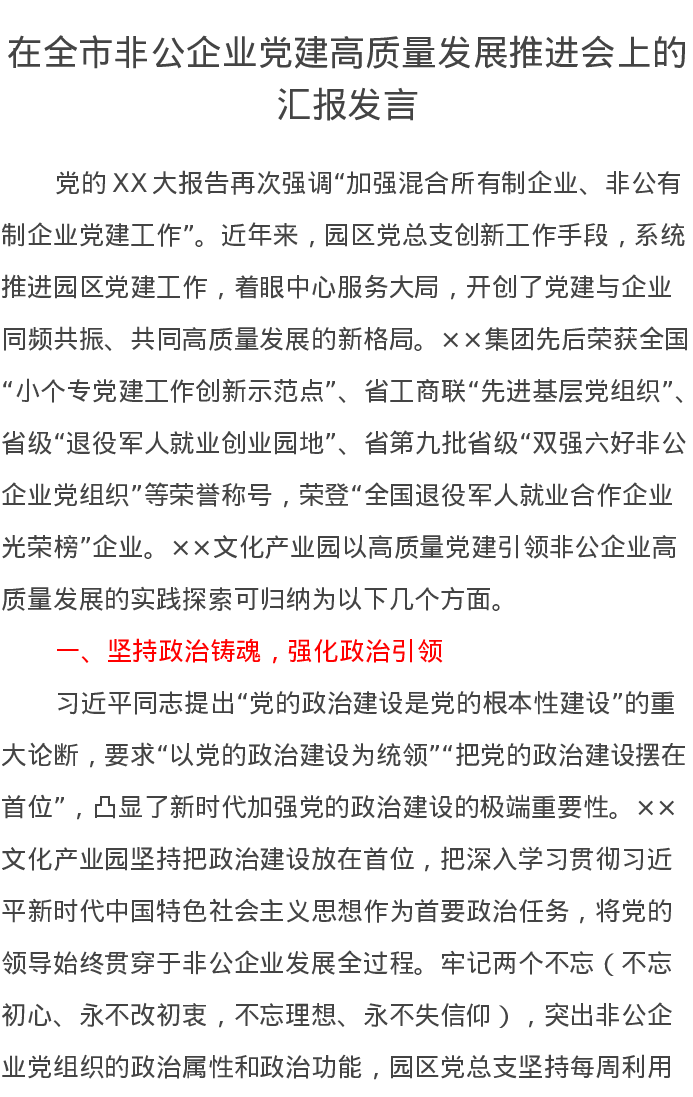 在全市非公企业党建高质量发展推进会上的汇报发言