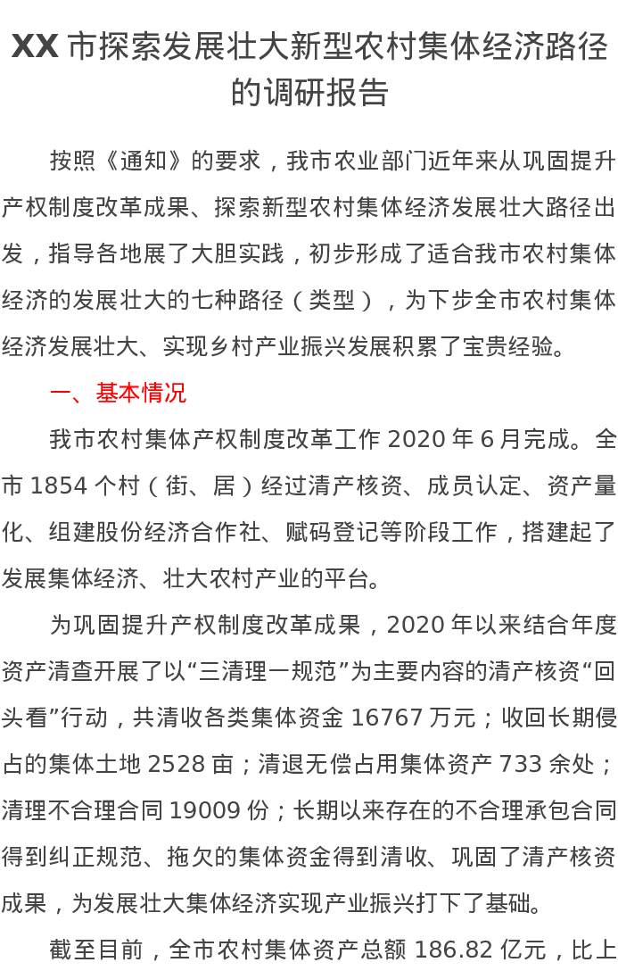 XX市探索发展壮大新型农村集体经济路径的调研报告