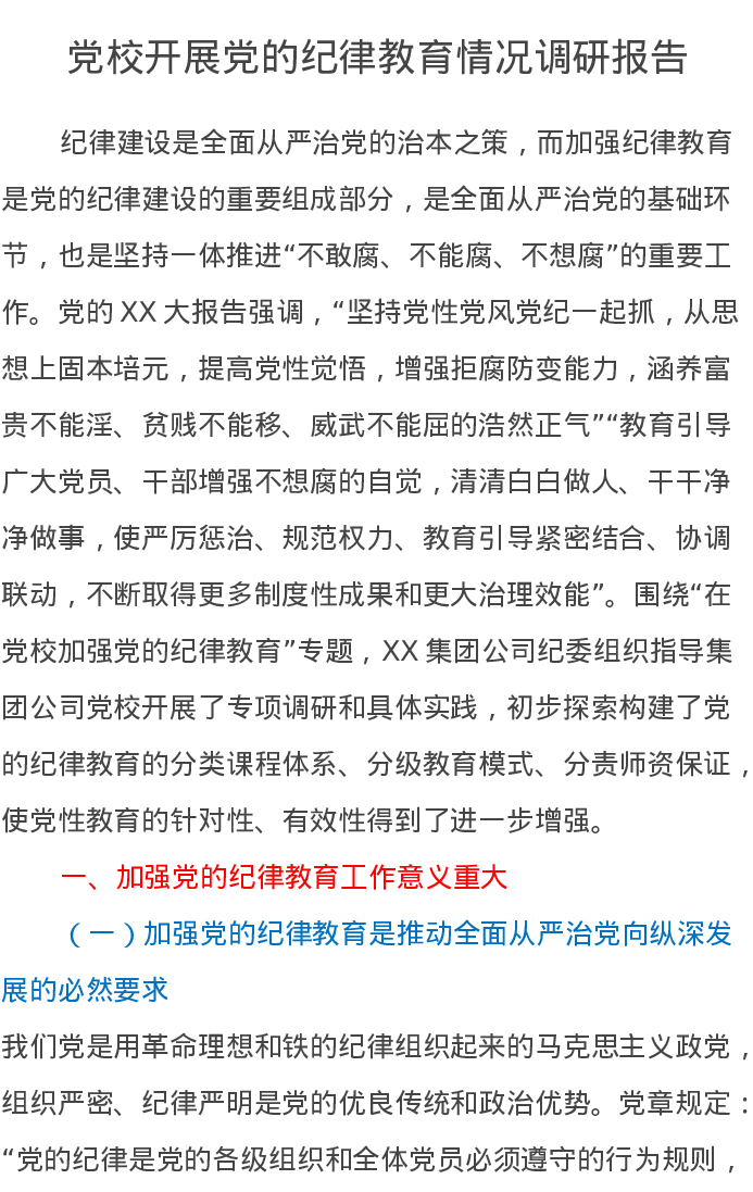 党校开展党的纪律教育情况调研报告