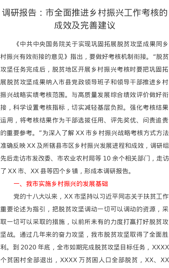 调研报告:市全面推进乡村振兴工作考核的成效及完善建议