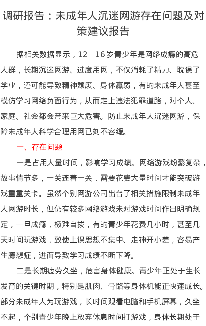 调研报告:未成年人沉迷网游存在问题及对策建议报告