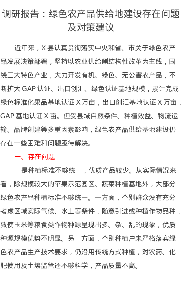 调研报告:绿色农产品供给地建设存在问题及对策建议报告