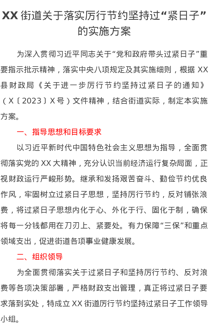 XX街道关于落实厉行节约坚持过“紧日子”的实施方案