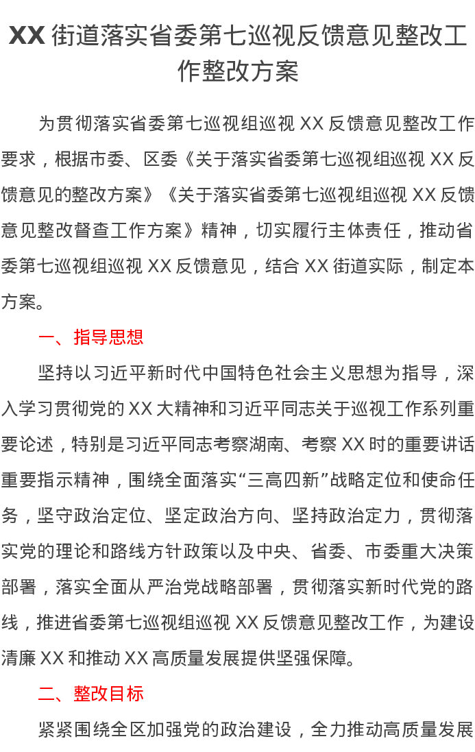 XX街道落实省委第七巡视反馈意见整改工作整改方案