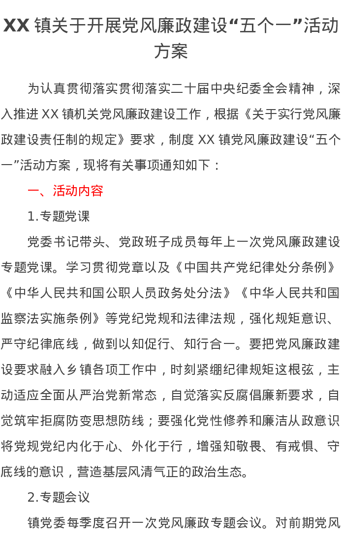 XX镇关于开展党风廉政建设“五个一”活动方案