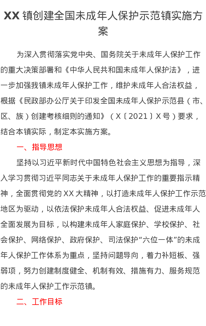 XX镇创建全国未成年人保护示范镇实施方案