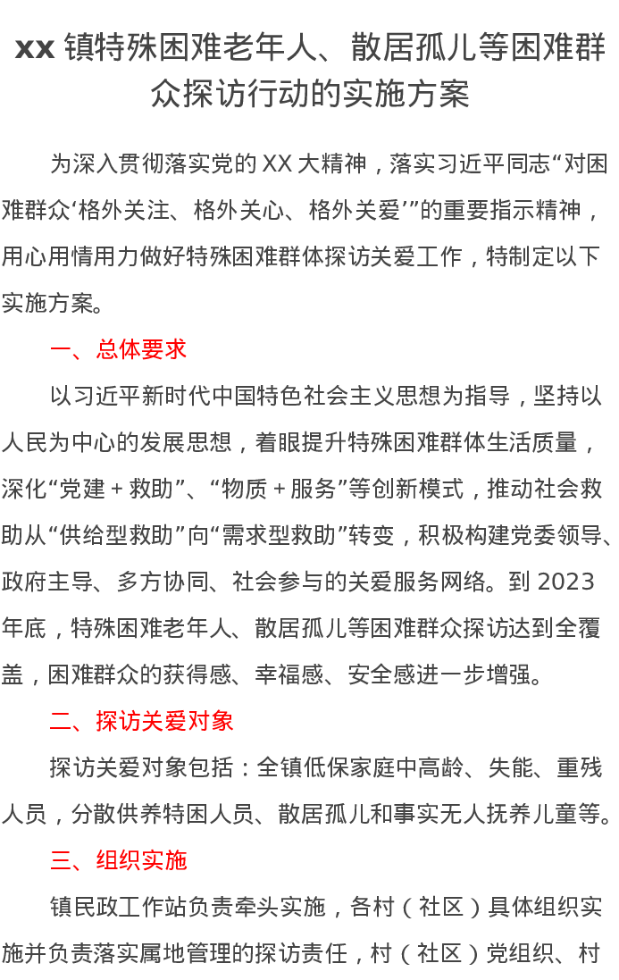 xx镇特殊困难老年人、散居孤儿等困难群众探访行动的实施方案