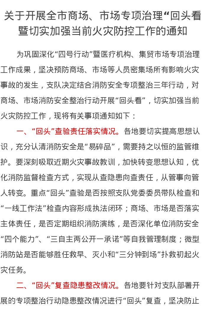关于开展全市商场、市场专项治理“回头看暨切实加强当前火灾防控工作的通知