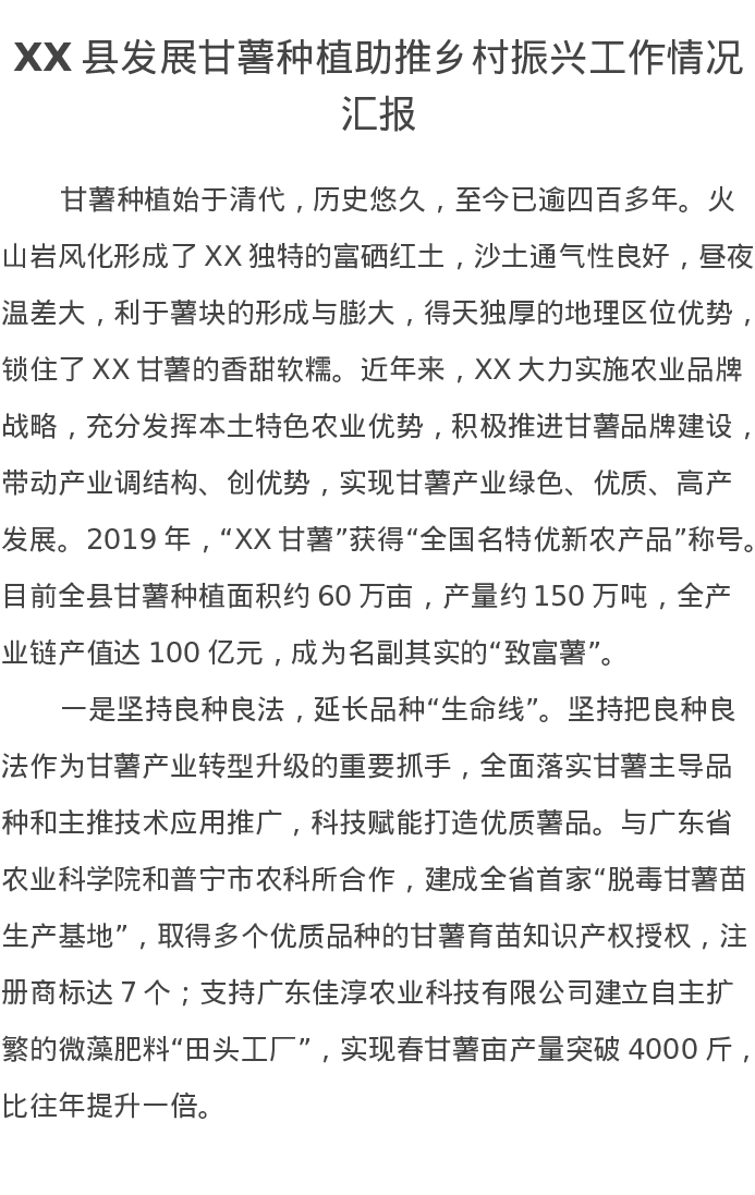 XX县发展甘薯种植助推乡村振兴工作情况汇报