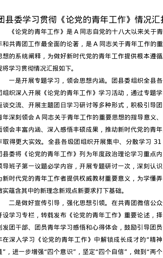 团县委学习贯彻《论党的青年工作》情况汇报