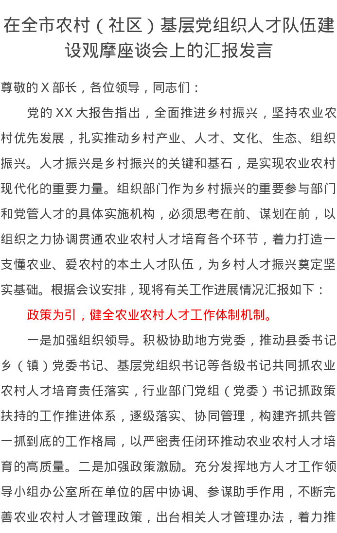在全市农村(社区)基层党组织人才队伍建设观摩座谈会上的汇报发言