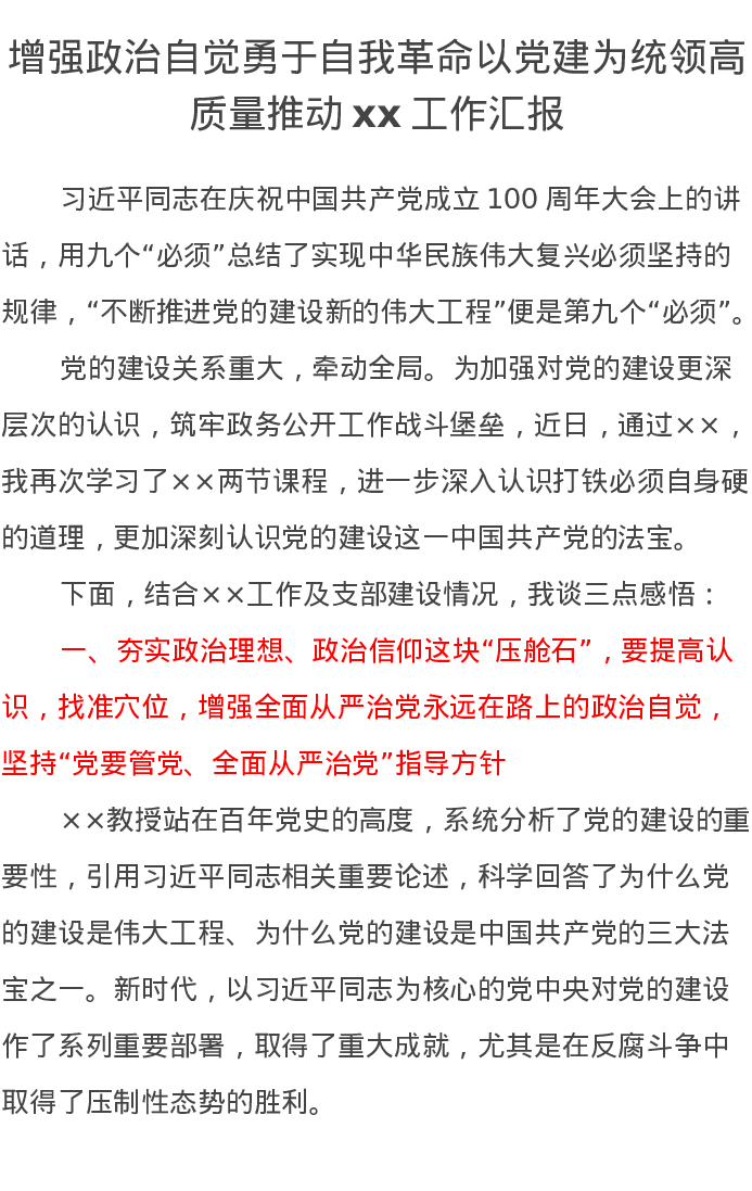 增强政治自觉勇于自我革命以党建为统领高质量推动xx工作汇报