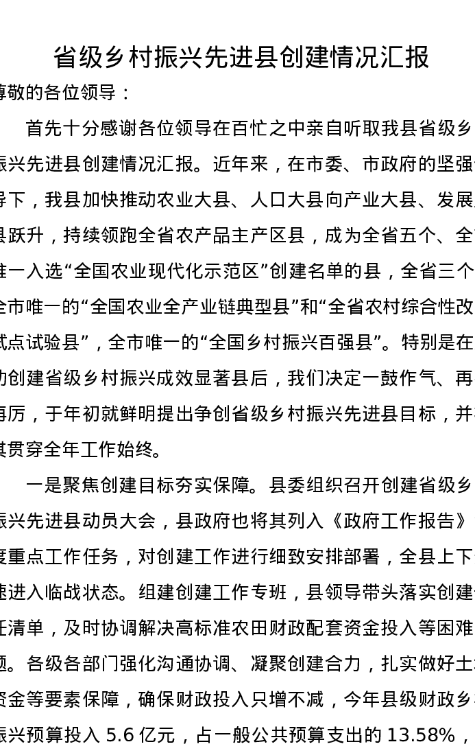 省级乡村振兴先进县创建情况汇报