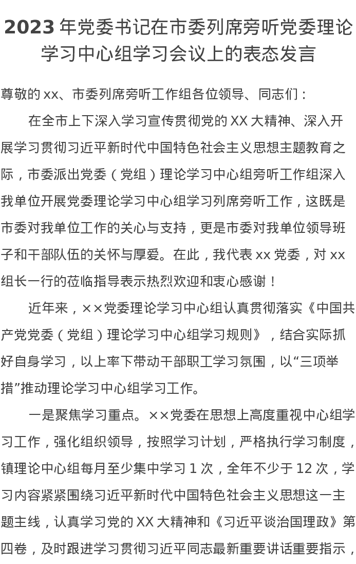2023年党委书记在市委列席旁听党委理论学习中心组学习会议上的表态发言