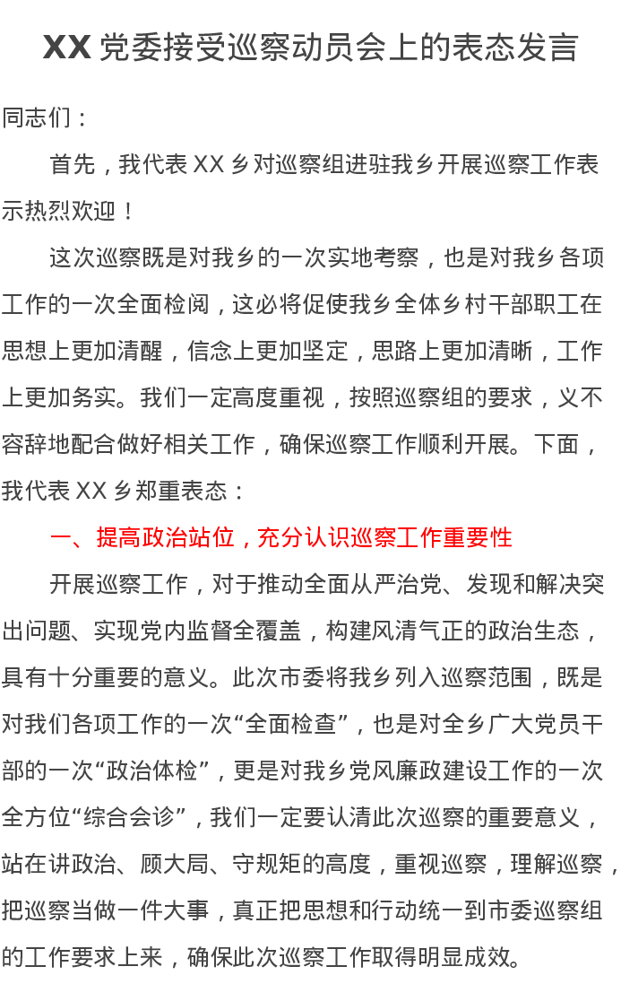 XX党委接受巡察动员会上的表态发言