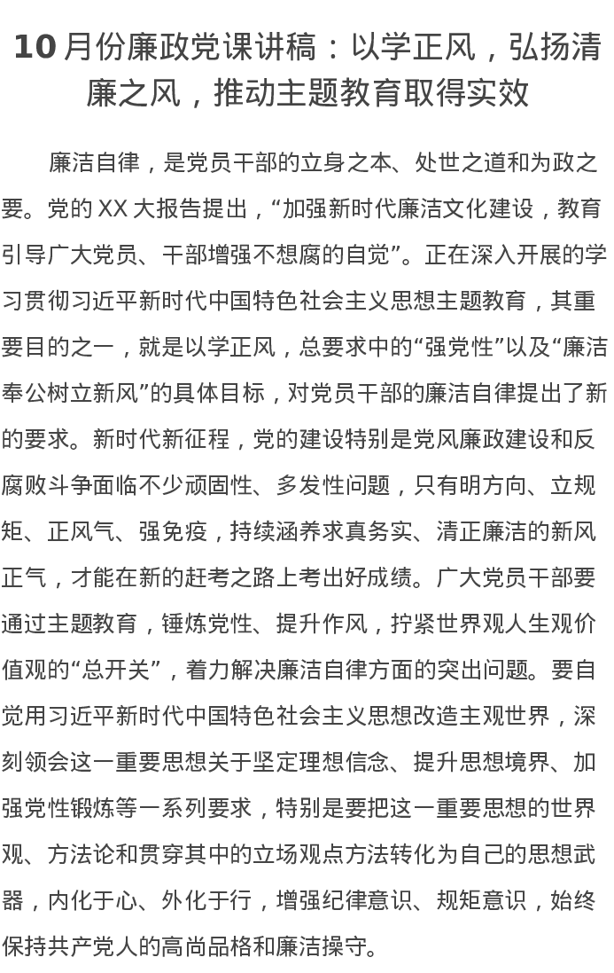 10月份廉政党课讲稿:以学正风,弘扬清廉之风,推动主题教育取得实效(特色社会主义思想)