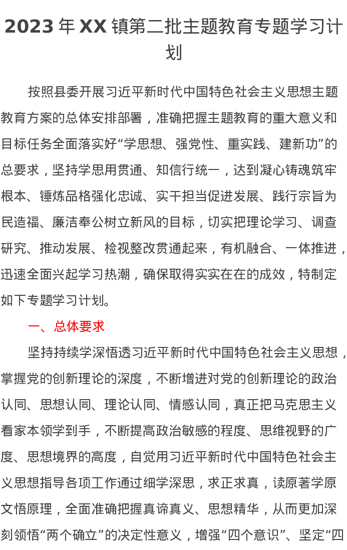 2023年XX镇第二批主题教育专题学习计划(特色社会主义思想)