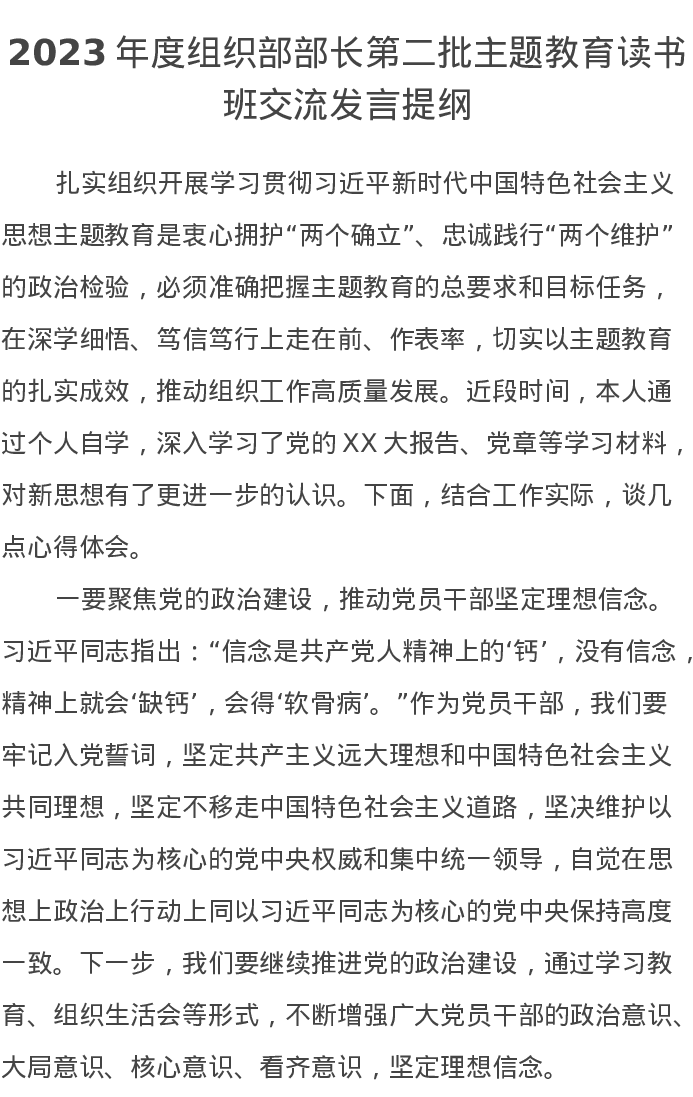 2023年度组织部部长第二批主题教育读书班交流发言提纲(特色社会主义思想)
