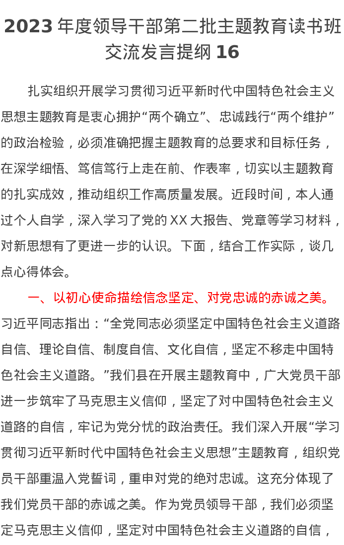 2023年度领导干部第二批主题教育读书班交流发言提纲16(特色社会主义思想)