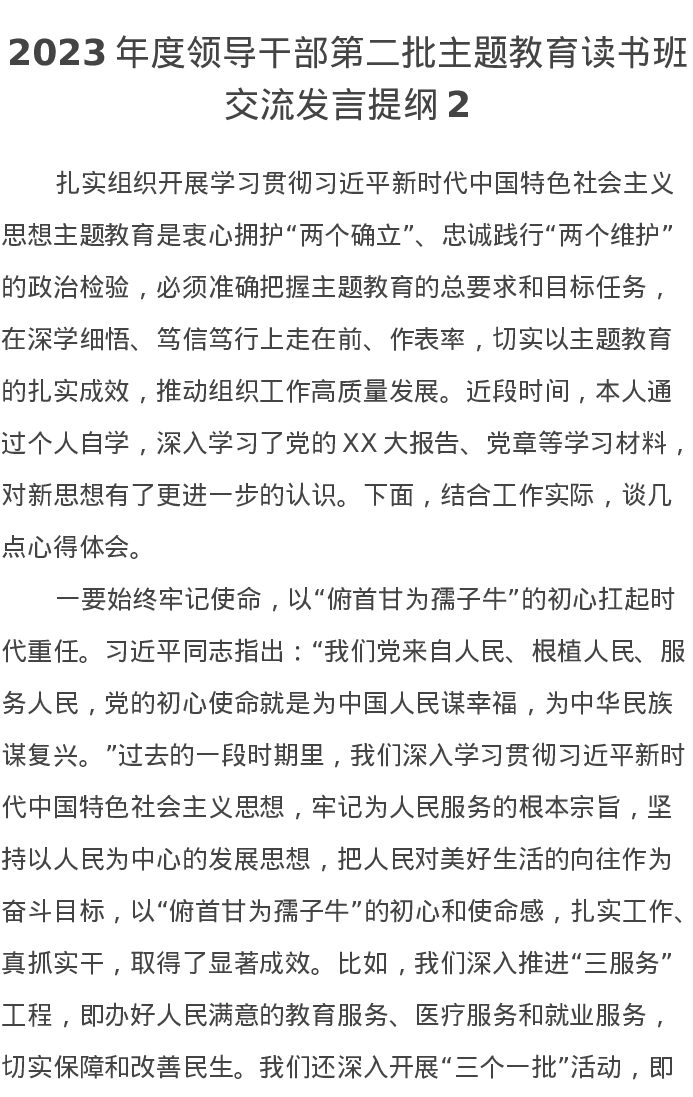 2023年度领导干部第二批主题教育读书班交流发言提纲2(特色社会主义思想)