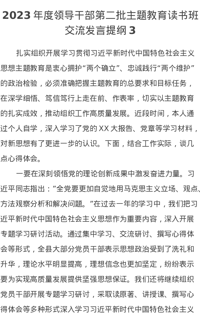 2023年度领导干部第二批主题教育读书班交流发言提纲3(特色社会主义思想)