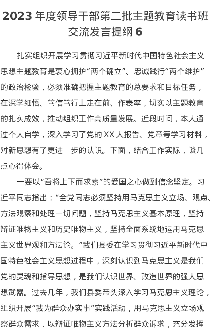 2023年度领导干部第二批主题教育读书班交流发言提纲6(特色社会主义思想)
