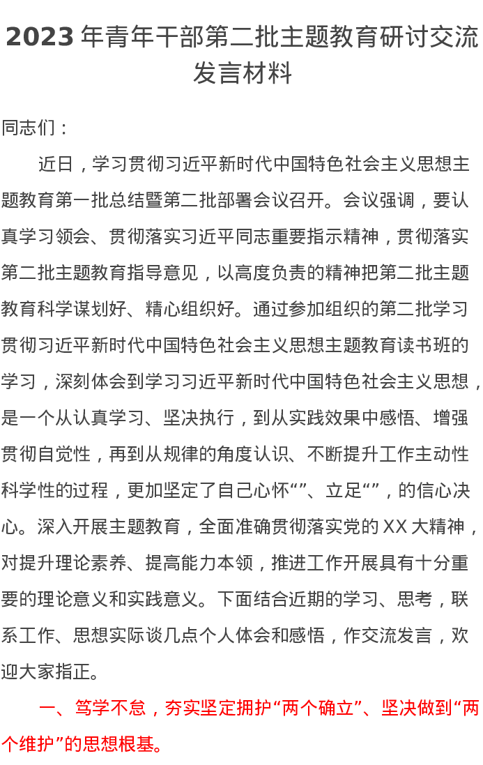 2023年青年干部第二批主题教育研讨交流发言材料(特色社会主义思想)