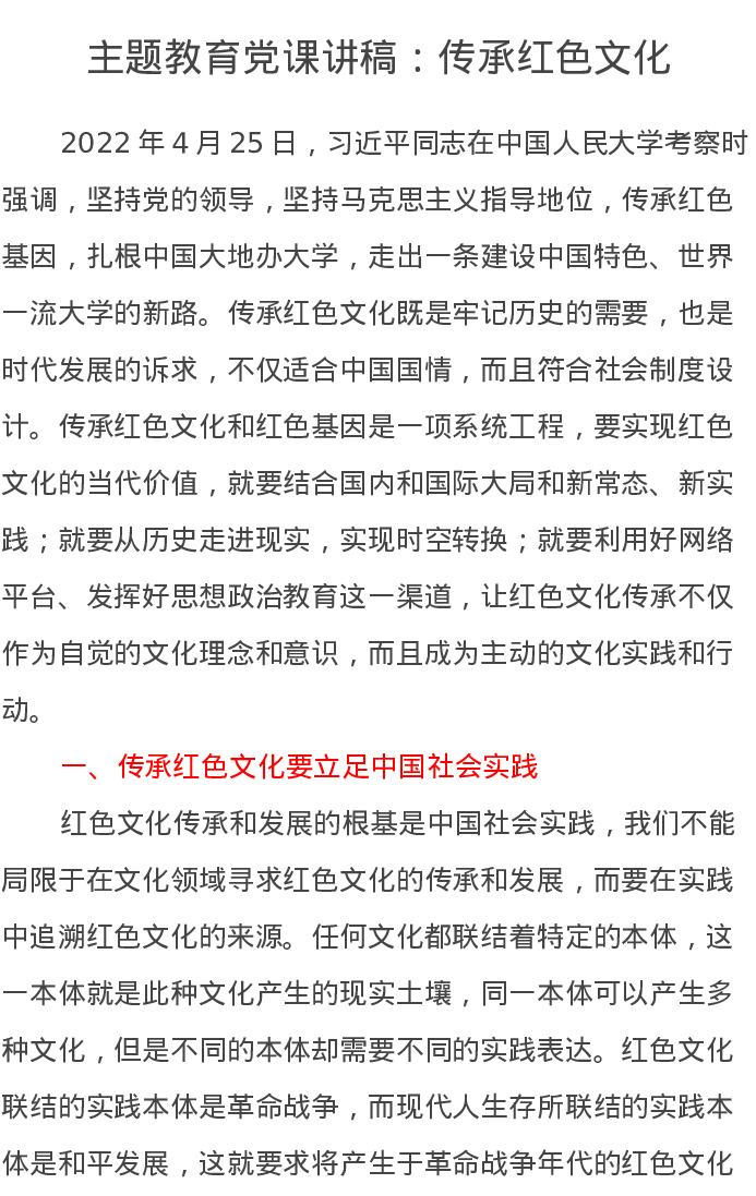主题教育党课讲稿:传承红色文化(特色社会主义思想)