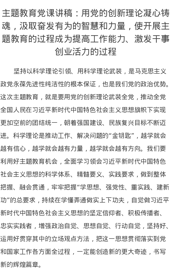 主题教育党课讲稿:用党的创新理论凝心铸魂,汲取奋发有为的智慧和力量,使开展主题教育的过程成为提高工作能力、激发干事创业活力的过程(特色社会主义思想)