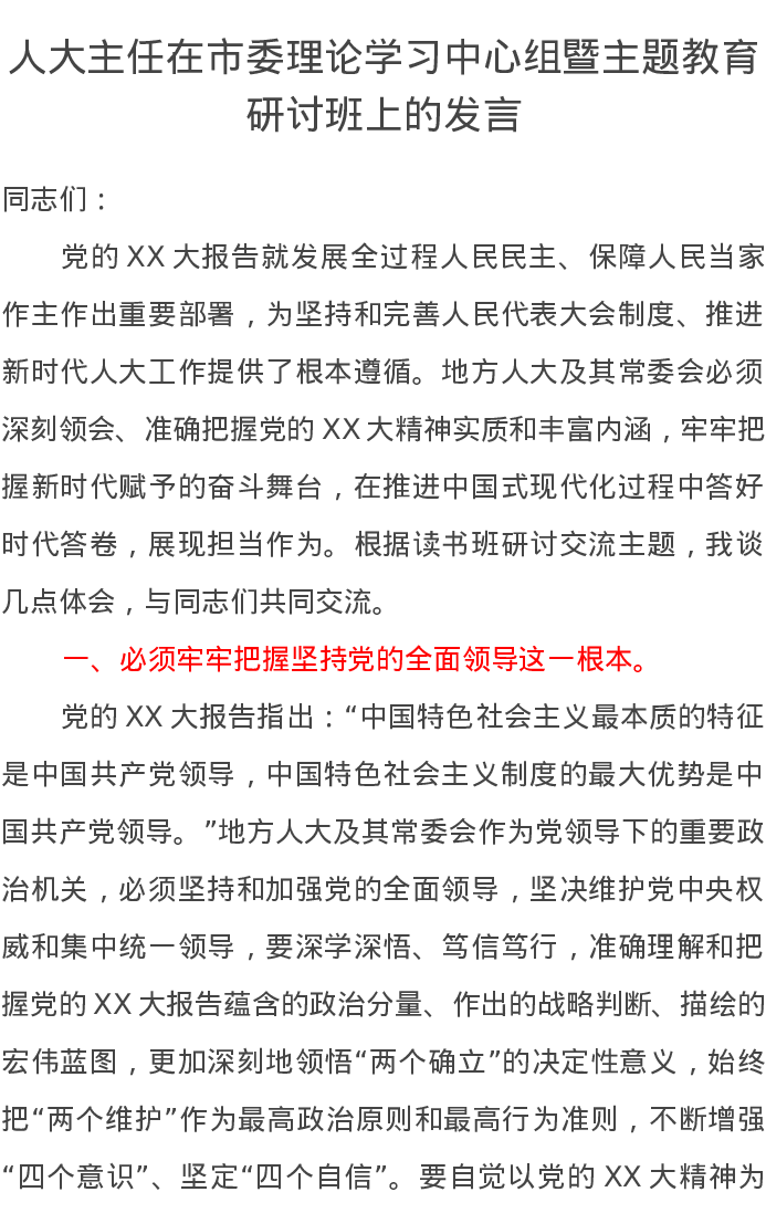 人大主任在市委理论学习中心组暨第二批主题教育研讨班上的发言(特色社会主义思想)