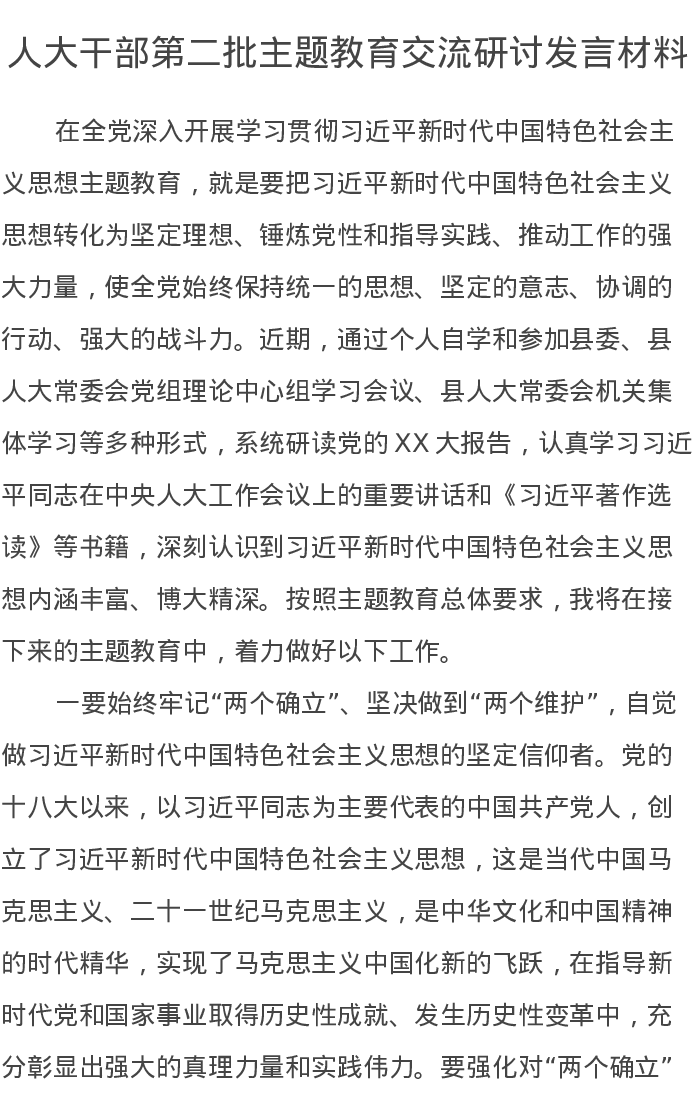 人大干部第二批主题教育交流研讨发言材料(特色社会主义思想)