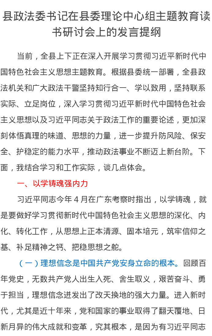 县政法委书记在县委理论中心组第二批主题教育读书研讨会上的发言提纲(特色社会主义思想)