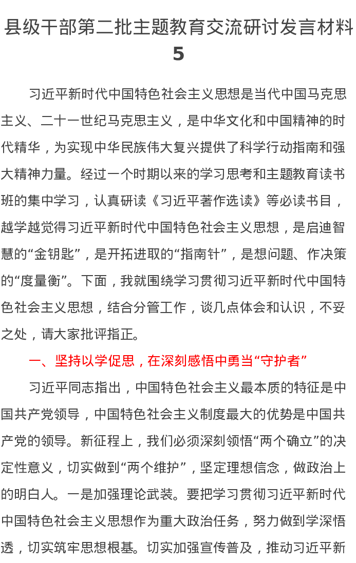 县级干部第二批主题教育交流研讨发言材料5(特色社会主义思想)
