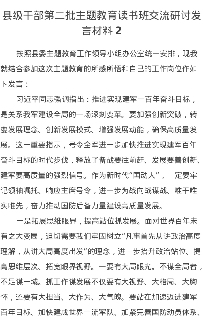 县级干部第二批主题教育读书班交流研讨发言材料2(特色社会主义思想)