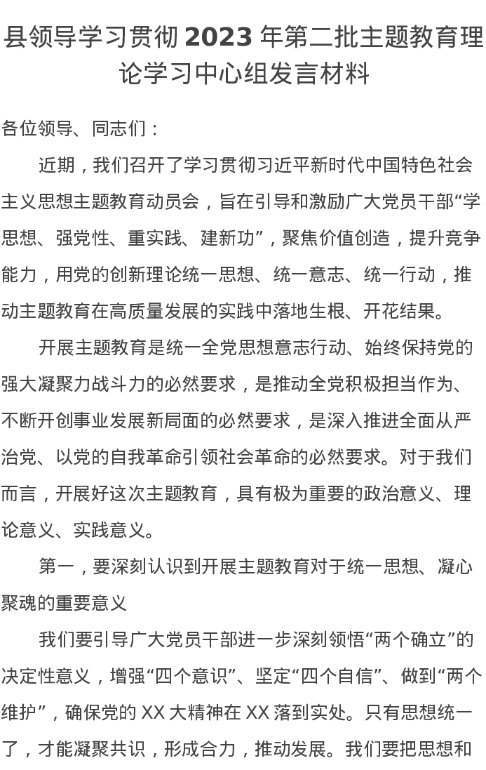 县领导学习贯彻2023年第二批主题教育理论学习中心组发言(特色社会主义思想)
