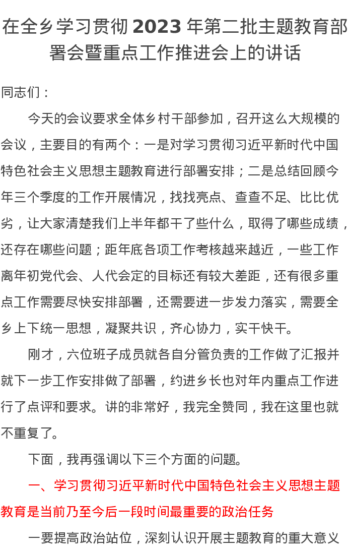 在全乡学习贯彻2023年第二批主题教育部署会暨重点工作推进会上的讲话(特色社会主义思想)