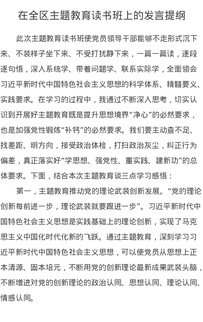 在全区第二批主题教育读书班上的发言提纲(特色社会主义思想)