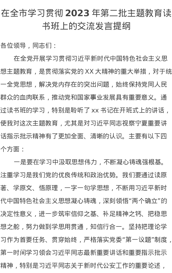 在全市学习贯彻2023年第二批主题教育读书班上的交流发言提纲(特色社会主义思想)